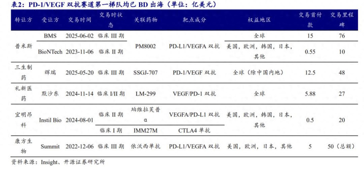 近年来,国产PD-(L)1/VEGF双抗达成了多个对外授权。2024年里,先是宜明昂科与Instil Bio达成海外授权协议,之后礼新医药也成功将PD-1/VEGF授权给了默沙东,两者的授权金额分别达到21亿美元和32亿美元,在去年一年中国创新药企License-out交易中居于前列。今年,普米斯的PD-L1/VEGF双抗又由BioNTech转给了BMS,交易金额暴涨,这款双抗身价瞬间升至90亿美元。